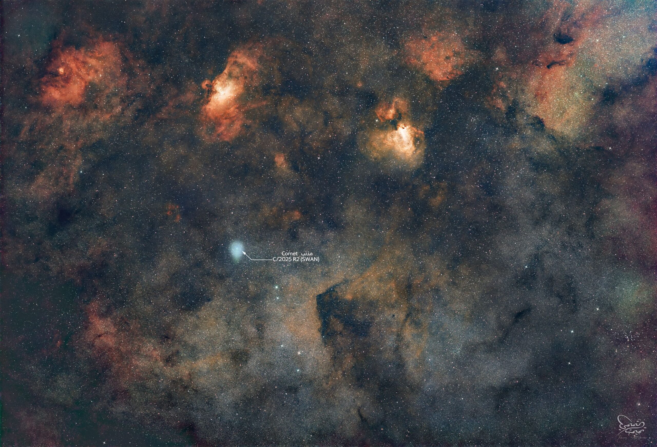 الشارقة في 23 أكتوبر / وام / رصدت جمعية الإمارات للفلك المذنب C/2025 R2 (SWAN)، الزائر القادم من أطراف النظام الشمسي، وذلك خلال مروره في موقع مميز بسماء الدولة يوم 18 أكتوبر الجاري.
