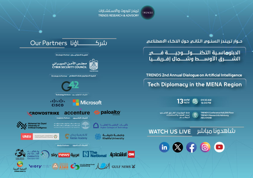 The 2nd Annual Dialogue on Artificial Intelligence, organized by TRENDS Research & Advisory, kicks off tomorrow in strategic partnership with the UAE Cybersecurity Council and 21 other partner entities, under the title Tech Diplomacy in the Middle East and North Africa. The event will feature researchers and experts from the Center for Strategic and International Studies (CSIS) in the United States, alongside speakers from Google, OpenAI, G42, GC REAIM, Khalifa University, Mohamed bin Zayed University of Artificial Intelligence, Mohamed bin Zayed University for Humanities, New York University Abu Dhabi, and other scientific and academic institutions.